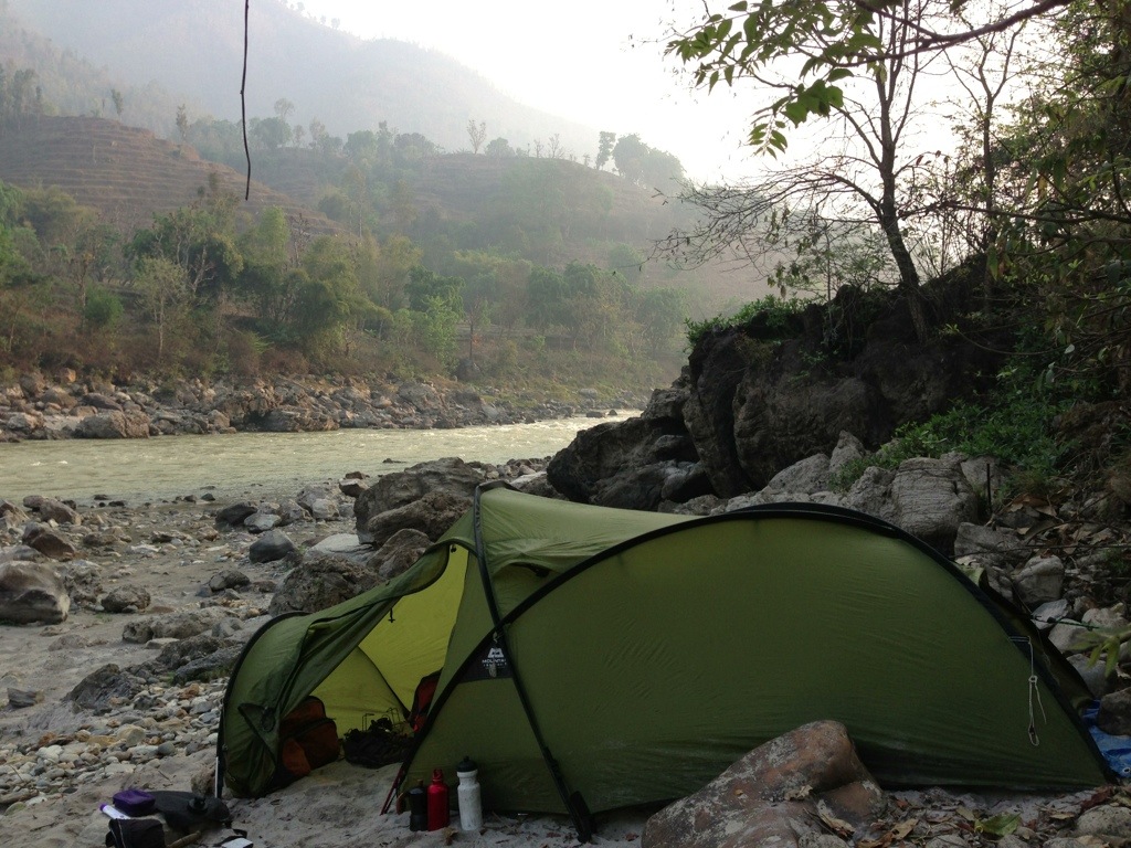Another hot day cycling. I had two ‘milk teas’ and ring ‘doughnuts’ in the morning to boost my energy reserves. I stopped in Damauli to buy supplies. The road itself was in good condition and ran high alongside a wide river. It provided amazing views. I cycled beyond an hydroelectric station and eventually found a fantastic spot to camp on the bank of the river.