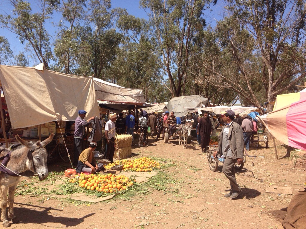 I took the R204 East from Safi towards Marrakech. The weather remained unusually hot. After tea at Brougueda I wandered around the local open market on a plot just out of town. The journey East through flat treeless plains was fairly unremarkable. Finally, and with a few welcome hills changing the landscape, I popped my tent up in a row of stones waiting to be made into a wall on the edge of a field. My route joined the N7 at Oulad Dlim and headed South towards Marrakech. Increasingly the road became hillier and amongst the distant haze I could just make out the snow capped mountains of the Atlas range.