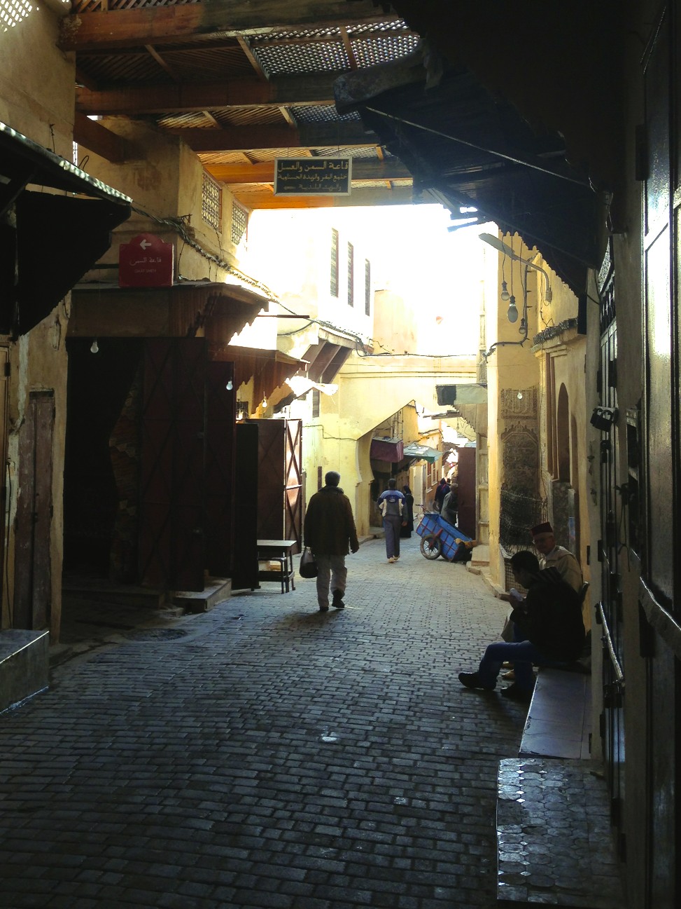 I pulled an all nighter and, having arrived in Fes (Fez) El Bali at three in the morning, found my way to the Western gate of Bab Boujeloud. It is a focus for travellers and many of the budget hotels are nearby. Once again street cleaners were my friends. The well equipped municipal cleaning services are very efficient at clearing the streets of the previous days rubbish. I had wandered in to a Southern gate of the Medina and after asking directions was escorted to Bab Boujeloud by one of the cleaners. I found the well recommended Hotel Cascade just inside the gate and returned to sit next to a Cafe with some of the cleaning team managers. The Cafe opened very early and so was able to enjoy a badly needed coffee.