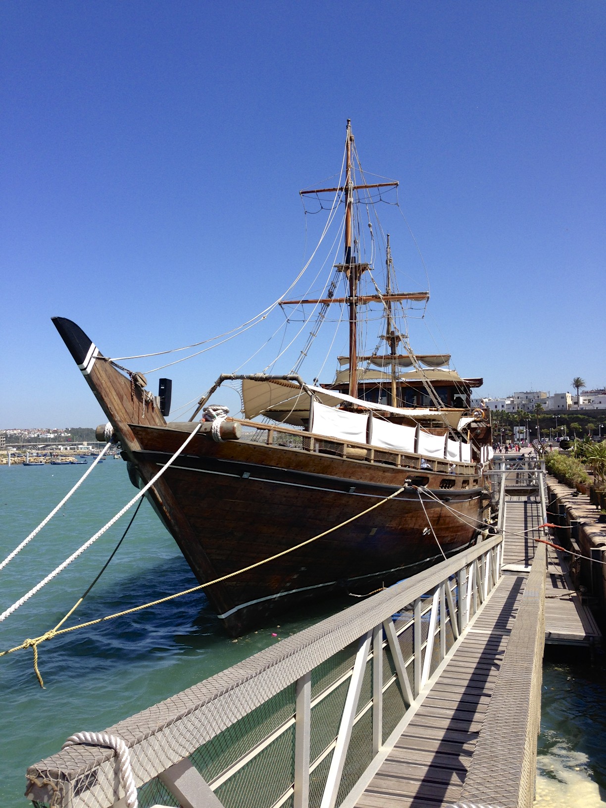 I made my way along the quay by the Bou Regreg. Rowing boats ferry passengers to Salé on the opposite shore. Once past a sailing ship converted for use as a restaurant I walked up hill towards the Hassan mosque and Mohammed V mausoleum.