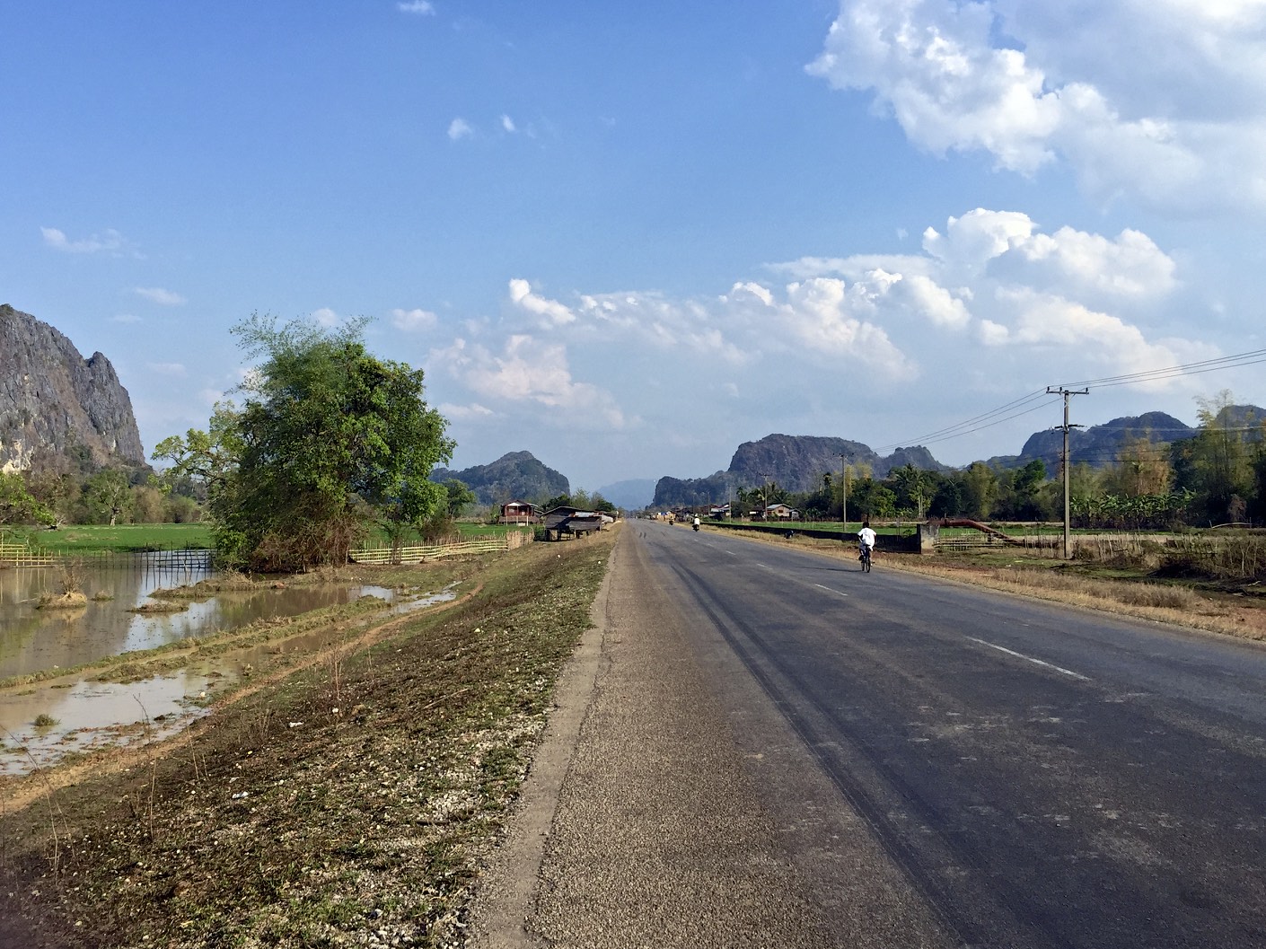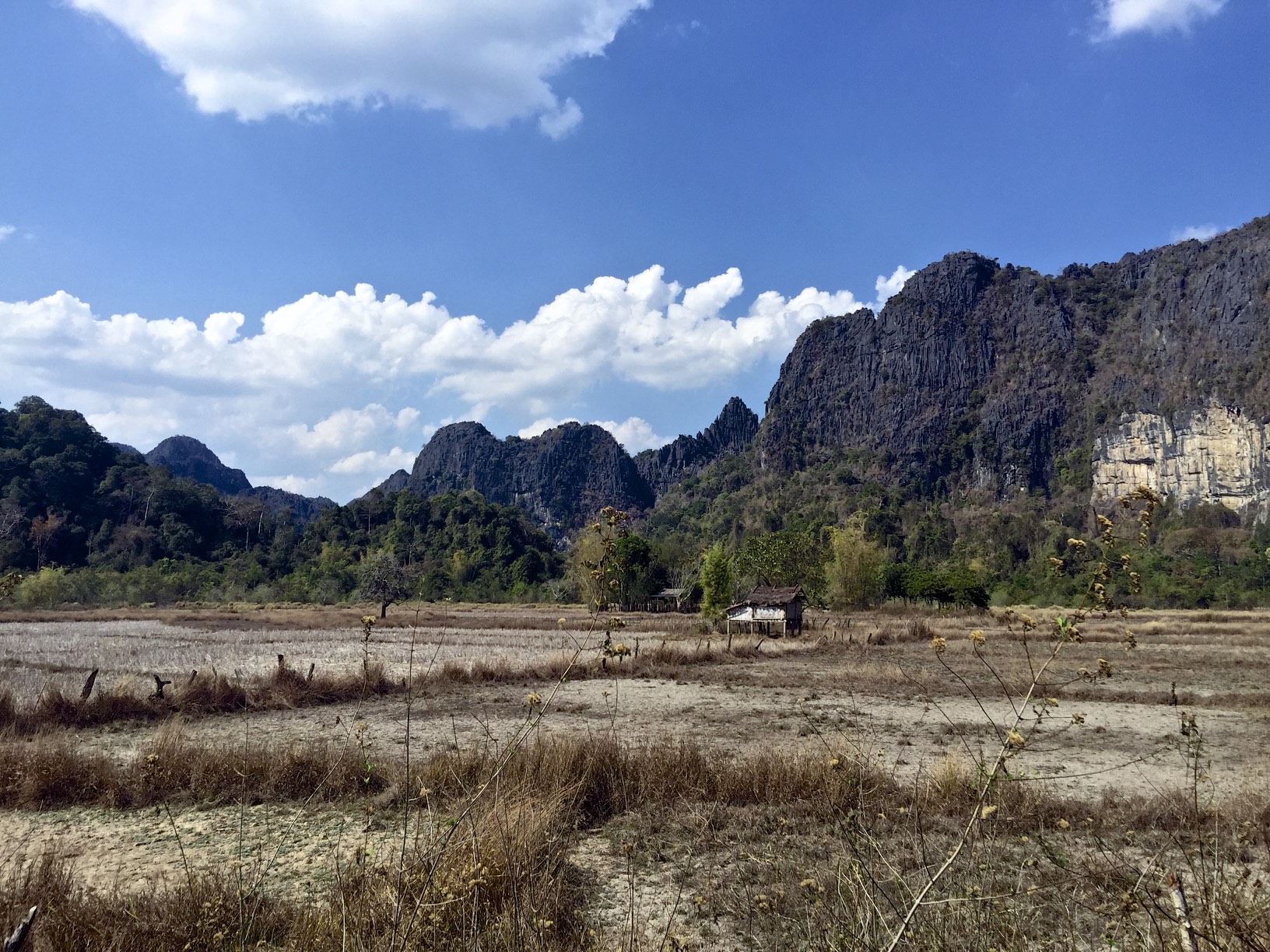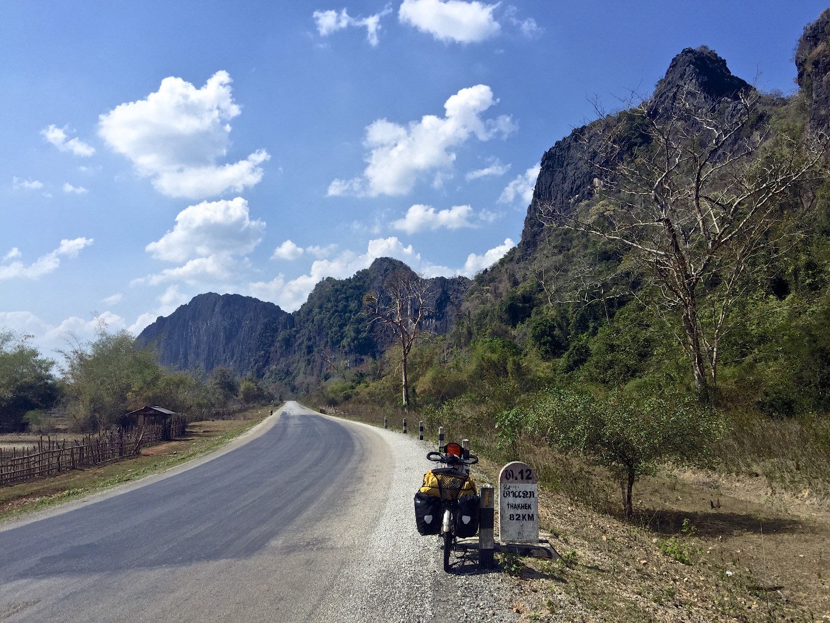 The dusty road from the Laos -Viet Nam border at Na Phao drops quickly and winds down into a valley. It was hot and dry and I was low on supplies. Most importantly I had not been able to change any money. So when I did finally find a shop my cash was worthless. I hungrily pressed on in the heat. Eventually I came across a woman selling water melons by the road. To my absolute delight she accepted a US dollar for one. I sat on an old rotten tree trunk and enjoyed that melon like no other before being stung by huge red ants. I moved off that log pretty quickly. The road (AH131) was pretty good with little traffic. I passed through a few small villages consisting mostly of stilted houses. But then came to the town of Nakai which not only had a BCel ATM but also a Laos Telecom office where I was able to get a sim for my phone. The day was starting to work out nicely. The scenery was great with karst-like hills all around.